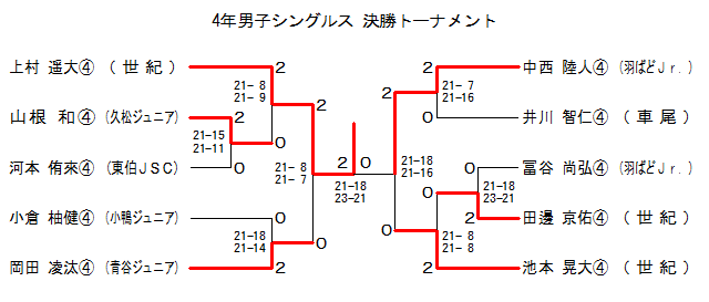 | MS4-4 | 青谷Jr. | 岡田凌汰C | 2 | 21-18 21-14 | 0 | 小倉柚健C | 小鴨Jr. | |