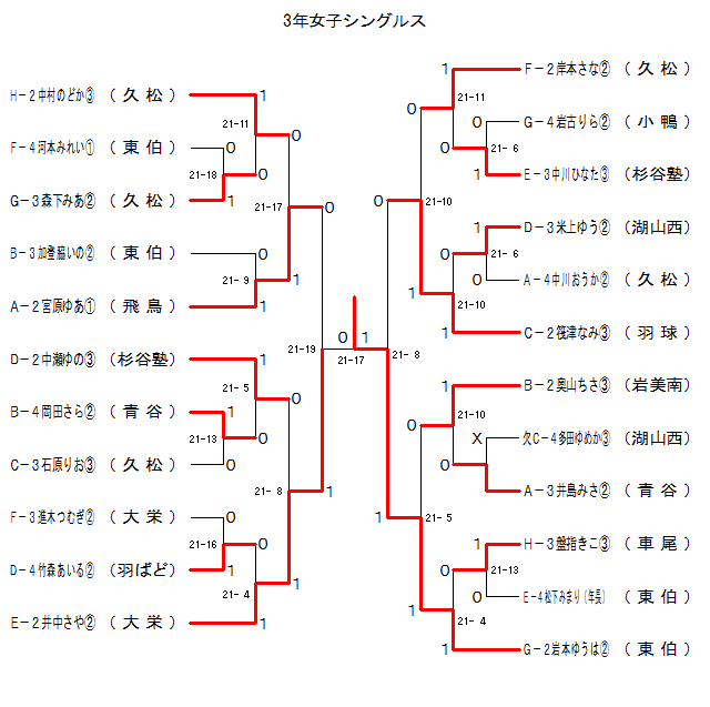 | WS3K-1 | 久松 | G−3森下みあA | 1 | 21-18 | 0 | F−4河本みれい@ | 東伯 | |